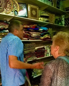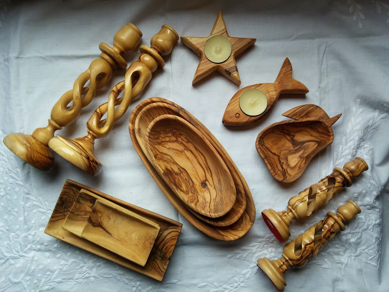 We buy our goods from various places – ceramics from the old city of Jerusalem, olive oil and soap from the village of Taybeh in the West Bank, olive wood crafts from Bethlehem, hand embroidered items from village cooperatives and refugee camps, for example.